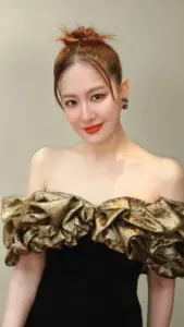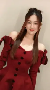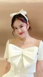 ทำให้ความสวยของเธอดูมีชีวิต ไม่ใช่เพียงความงามที่นิ่งเฉย เส้นผมสีน้ำตาลเข้มถูกจัดทรง อย่างประณีต ลอนผมอ่อน ๆ ทิ้งตัวลงบนบ่าอย่างเป็นธรรมชาติ ให้ความรู้สึกนุ่มนวล และ อ่อนหวาน ผมด้านบนถูกเกล้าอย่างเรียบร้อย ประดับด้วยเครื่องประดับเล็ก ๆ ที่เปล่งประกายแวววาว เสมือนอัญมณีที่ช่วยขับให้ความงามของเธอดูสูงส่ง และ สง่างามยิ่งขึ้น ทรงผมนี้ไม่เพียงเสริมให้ใบหน้าดูหวาน แต่ยังสะท้อนถึงความพิถีพิถัน และ รสนิยมอันละเอียดอ่อน
